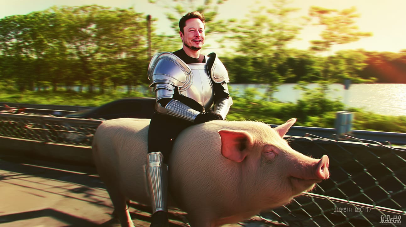 Image: Elon Musk in medieval armor riding a pig