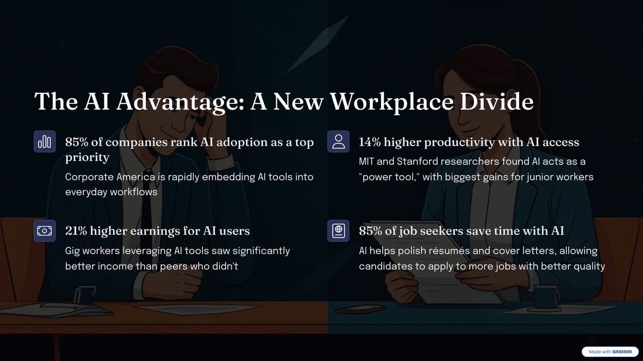 Over the past year, interest in AI has exploded across Corporate America. A recent survey by Bain & Company found that 85% of companies rank adopting AI as a top-five prioritybusinessinsider.com. This corporate push means AI tools like chatbots and image generators are increasingly embedded in workflows. For workers, early evidence shows that using AI can be a career booster. One landmark study in 2023 by MIT and Stanford researchers found that giving employees access to generative AI raised their productivity by 14% on average, with the biggest gains seen among junior and less-skilled workersbusinessinsider.com. In practical terms, AI became a βpower toolβ β much like a lawn mower or power drill, as Baldwin analogized β helping people accomplish more in less time without replacing the human effortbusinessinsider.com. Another analysis indicated that gig workers with multiple income streams who leveraged AI saw 21% higher earnings than their peers who didnβtbusinessinsider.com. The advantage of AI literacy is showing up in paychecks.
